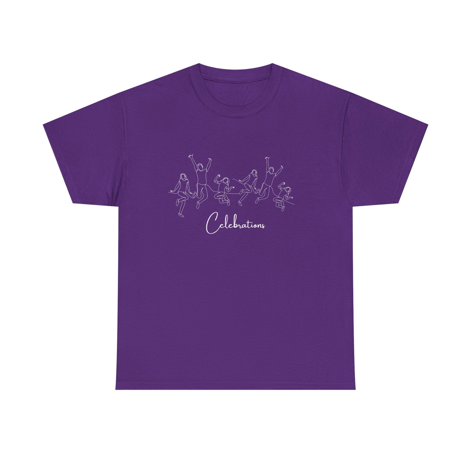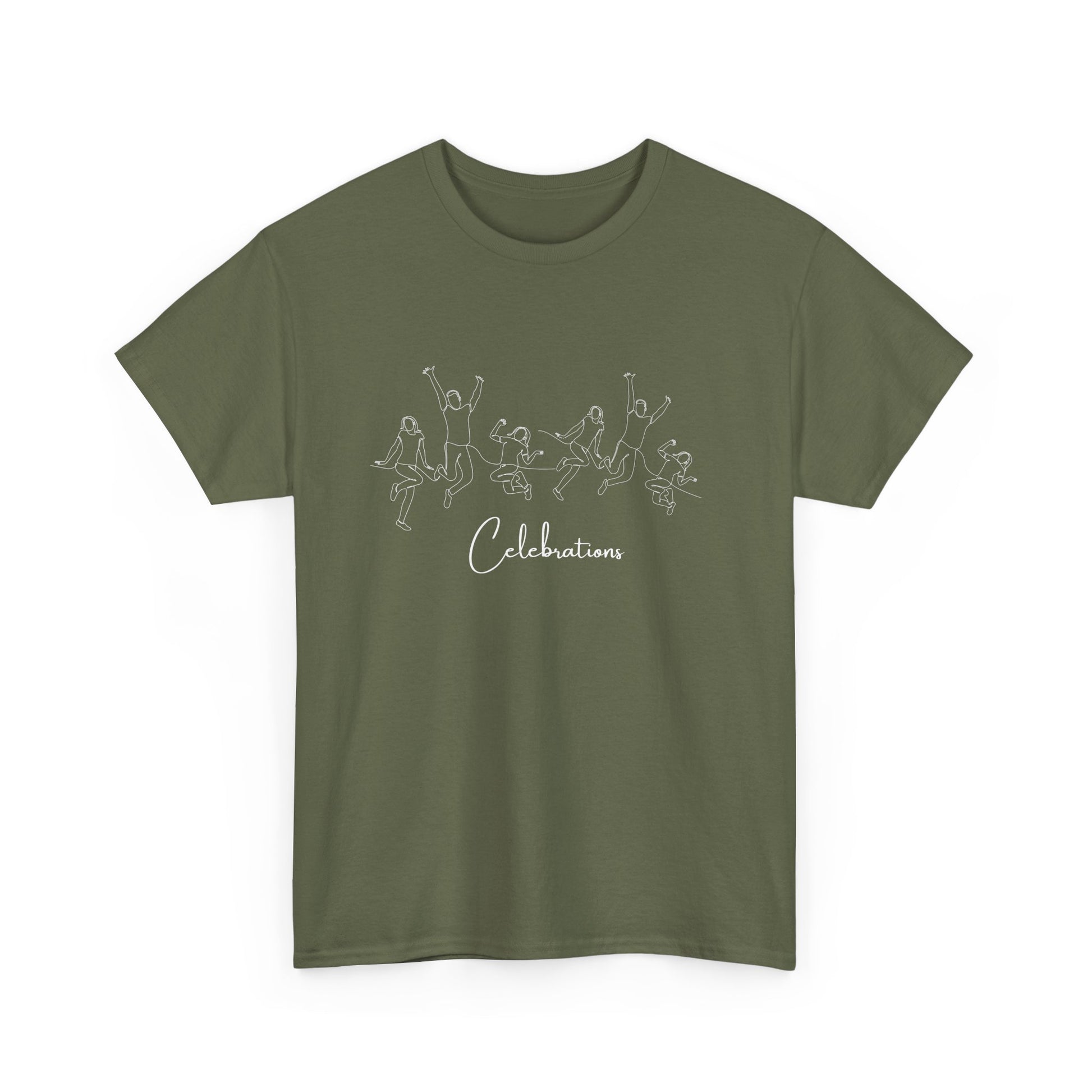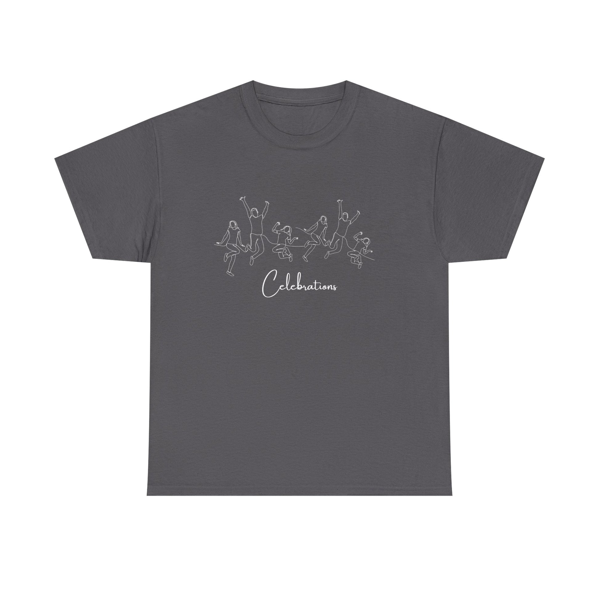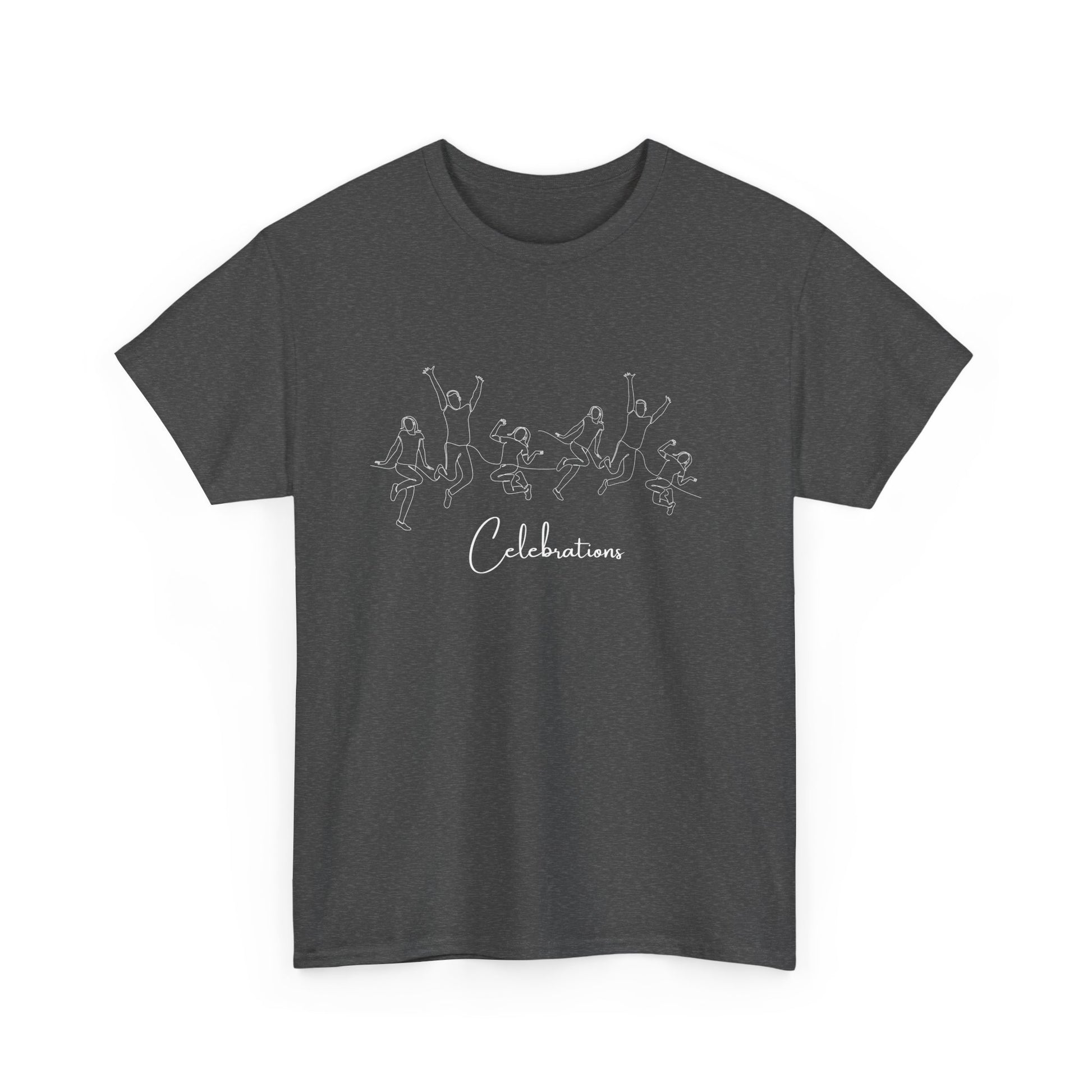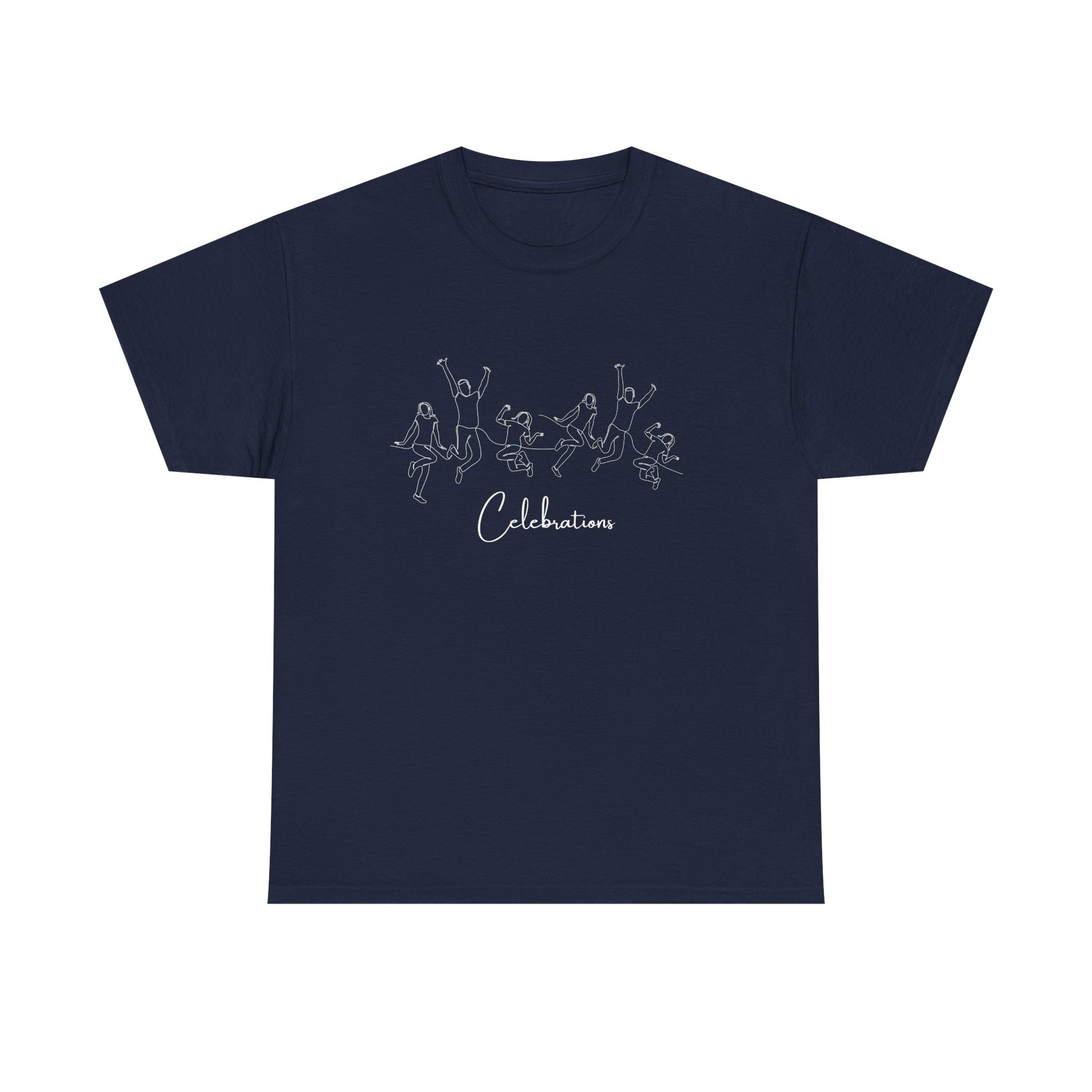 Soft, breathable cotton with a relaxed, classic cut — this tee carries a quiet energy. A minimalist line-drawing across the chest shows tiny celebratory figures and the handwritten word “Celebration,” rendered in crisp white on deep black. It reads like a private nod between friends: low-key but full of joy. Wear it to late‑night hangs, small apartment parties, or city strolls after a show. The shirt layers easily under a denim jacket or sits alone as a simple statement — comfortable enough to move in, tidy enough to feel put together.