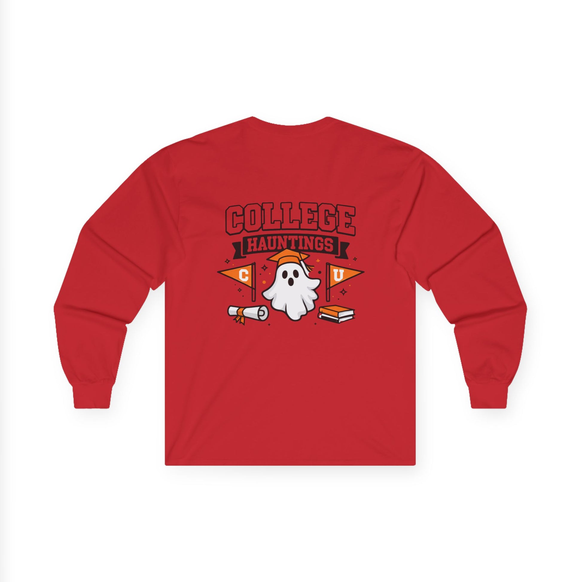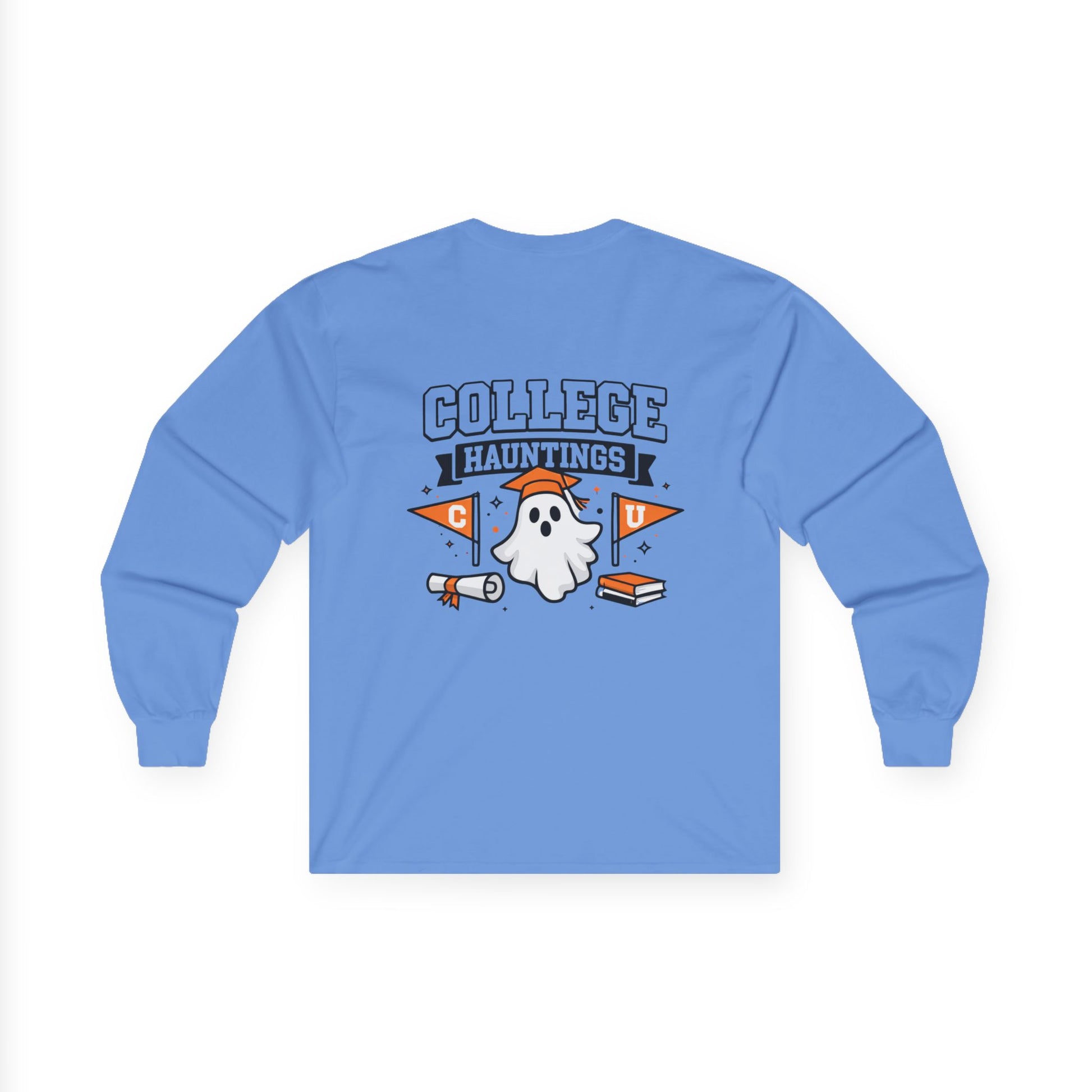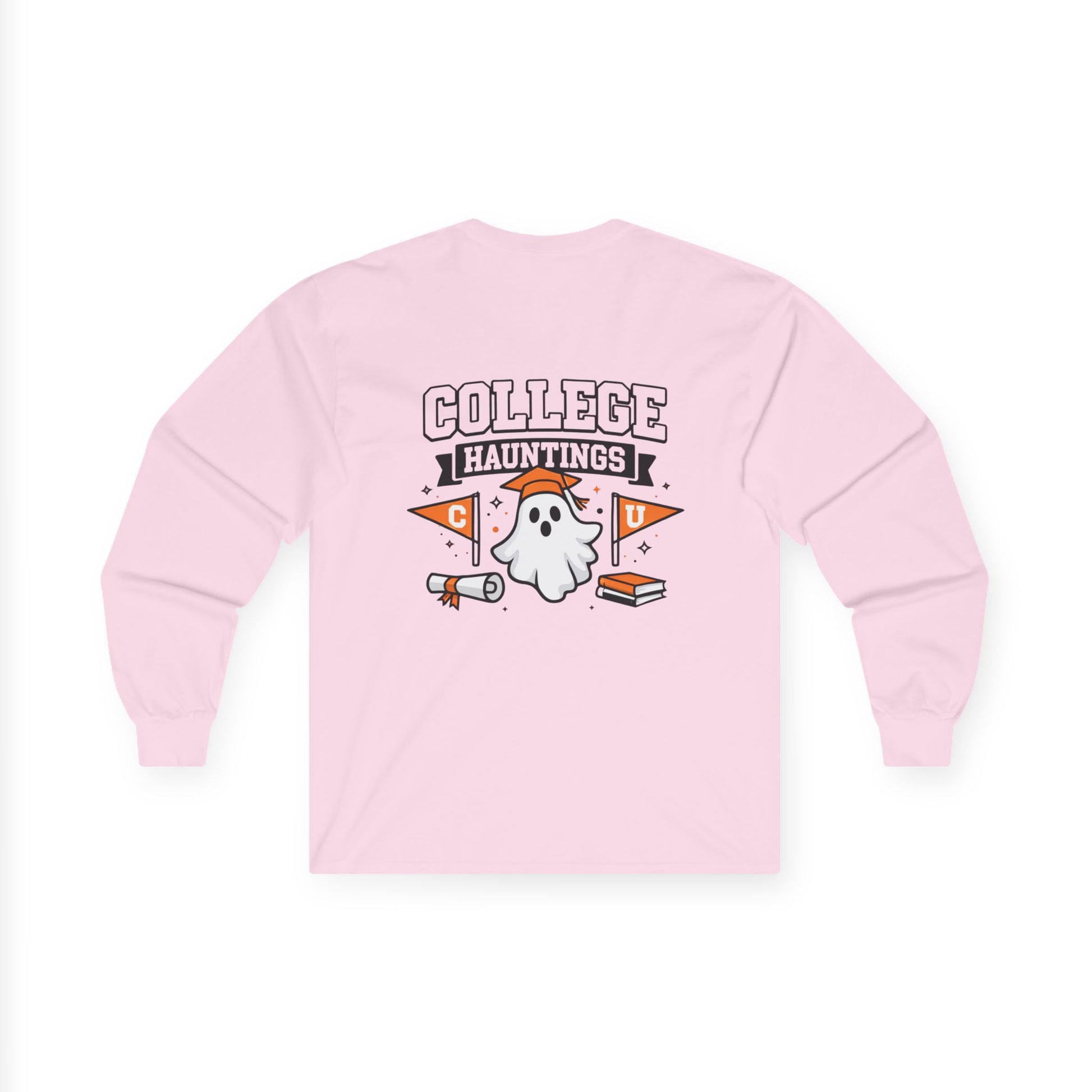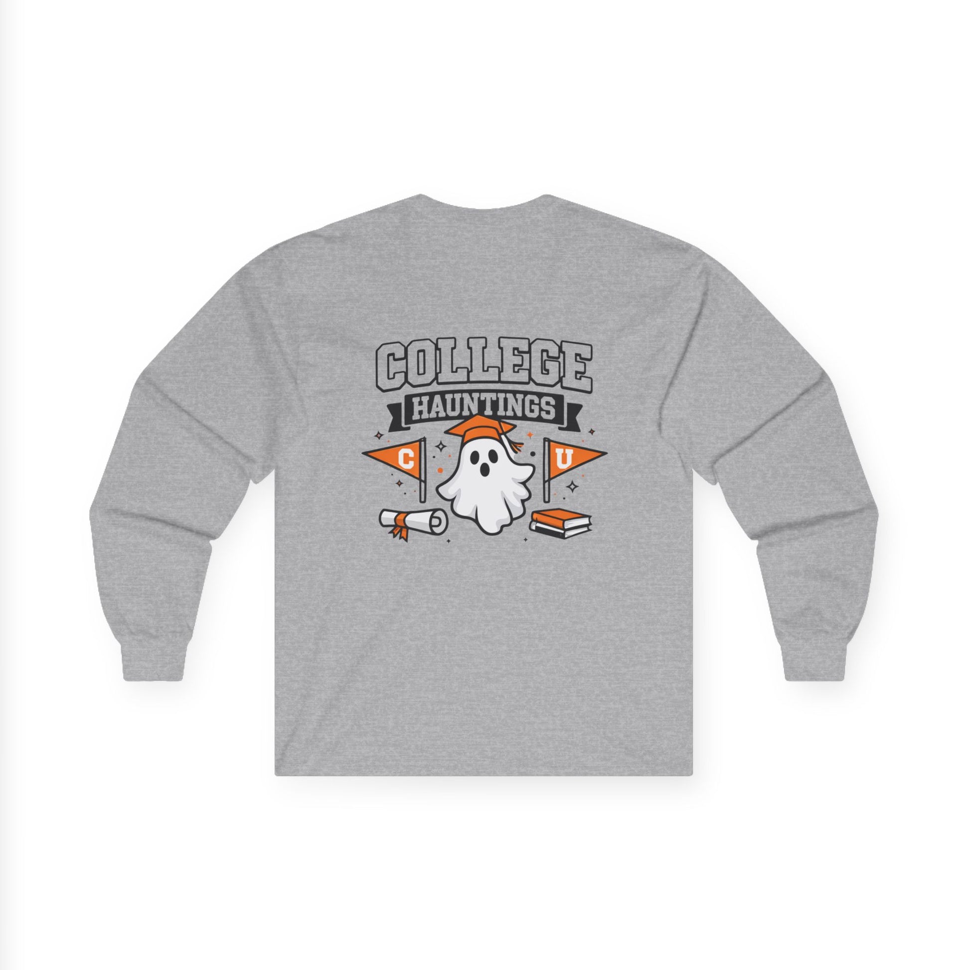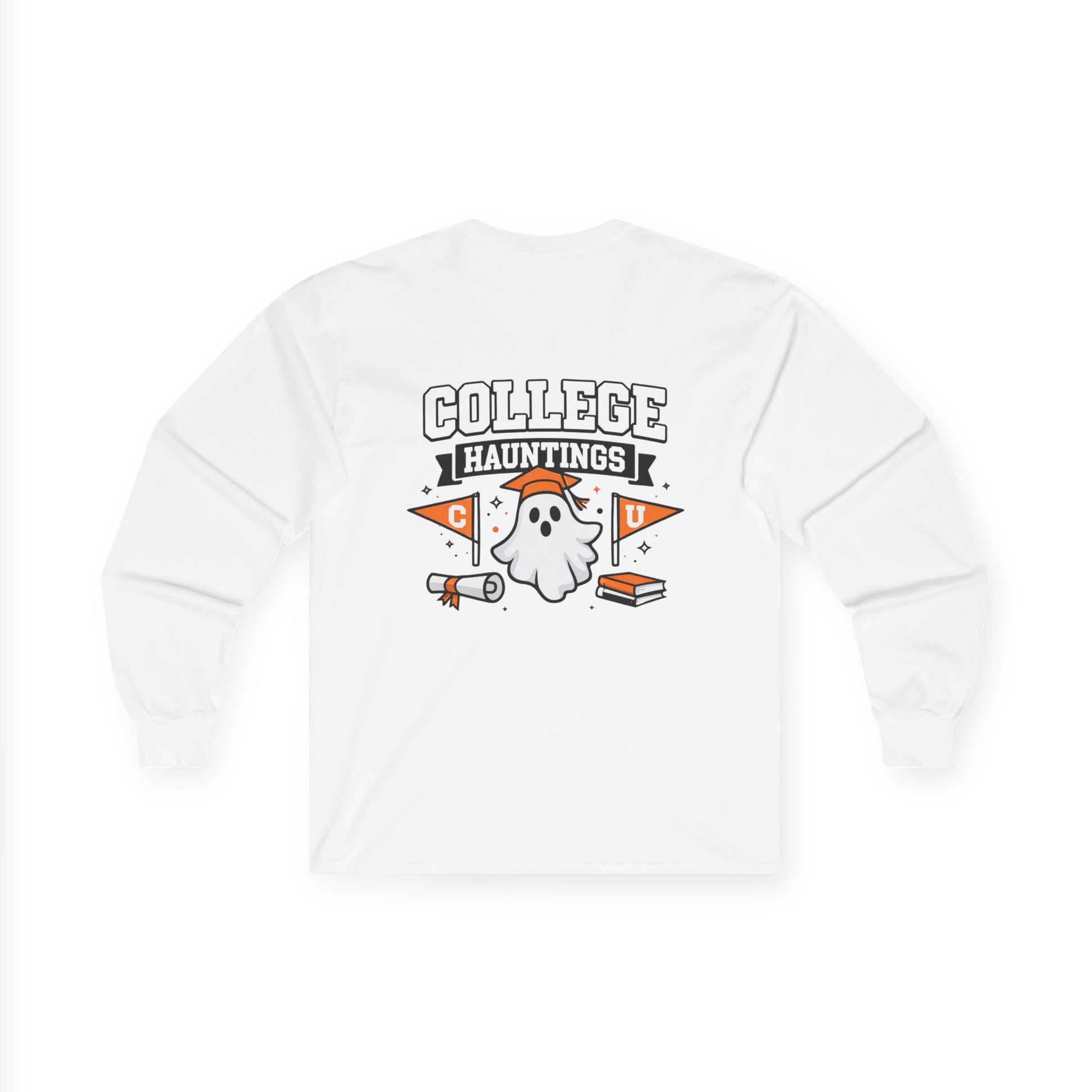 College Hauntings Long Sleeve Tee — Cute Ghost College Halloween Shirt