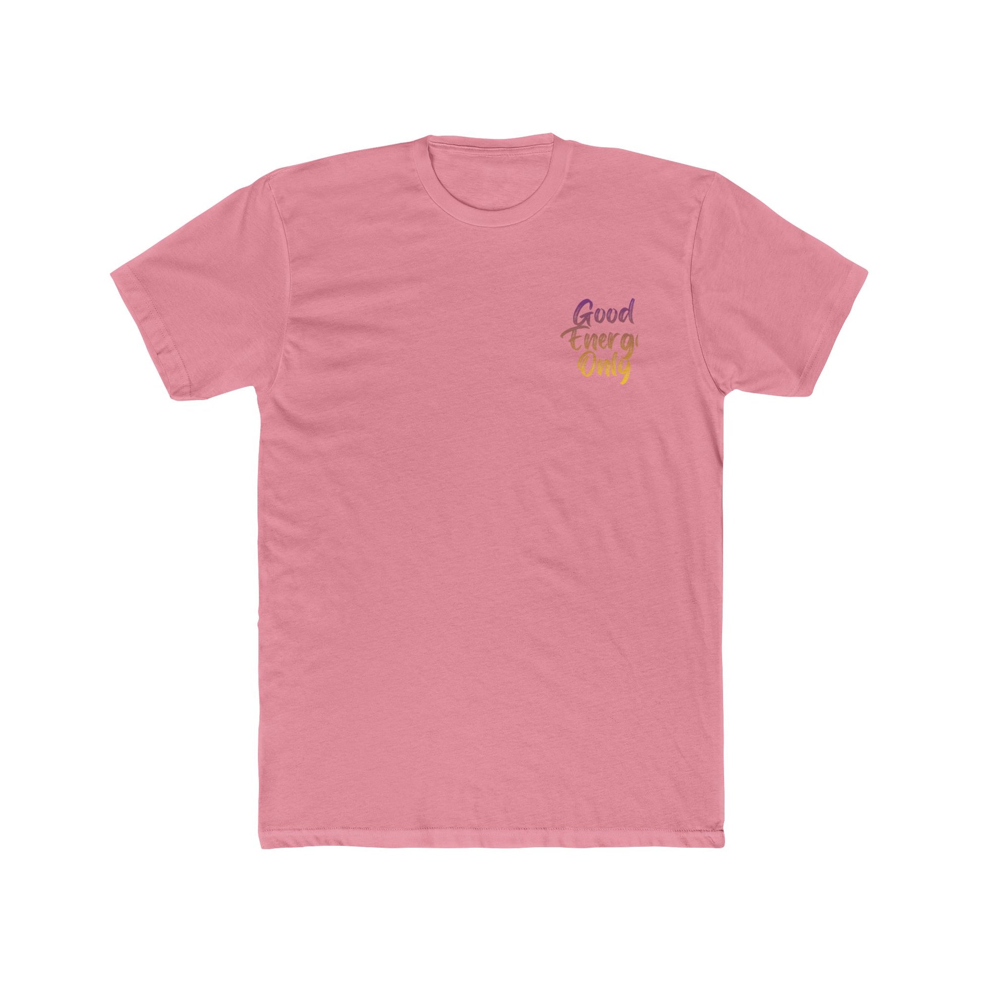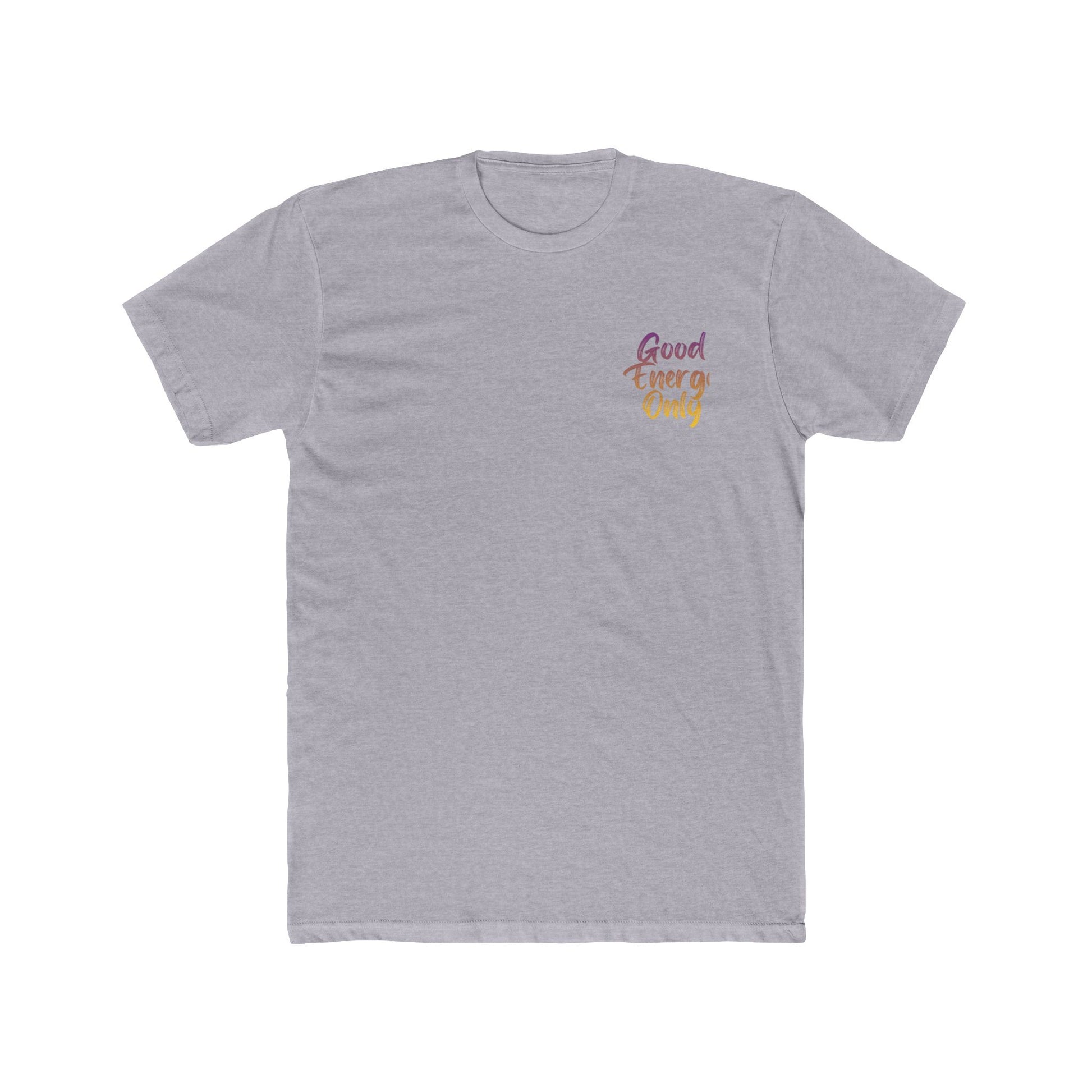 A lightweight cotton crew tee with a soft, centered script that reads 'Good Energy Only' in warm sunset tones. The shirt breathes easily and drapes cleanly thanks to its classic fit and crew neckline, making it an effortless layer for everyday wear. Subtle sleeve artwork applied with DTF keeps the look modern without overwhelming the minimalist front. Wear it on slow mornings with coffee, at laid-back meetups, or on afternoon walks when you want your vibe to speak gently but clearly.
