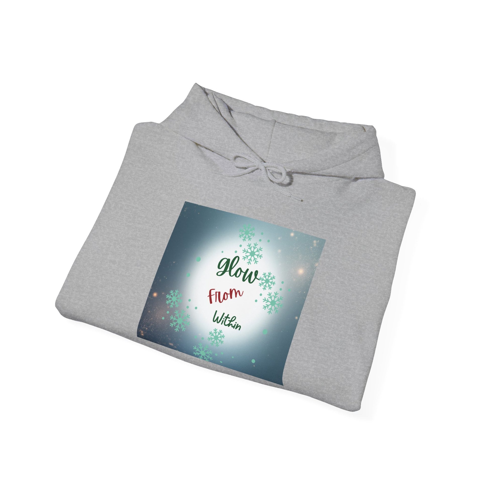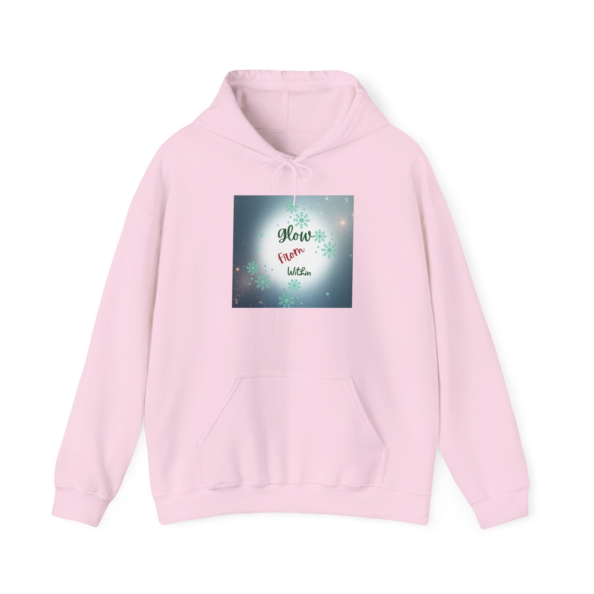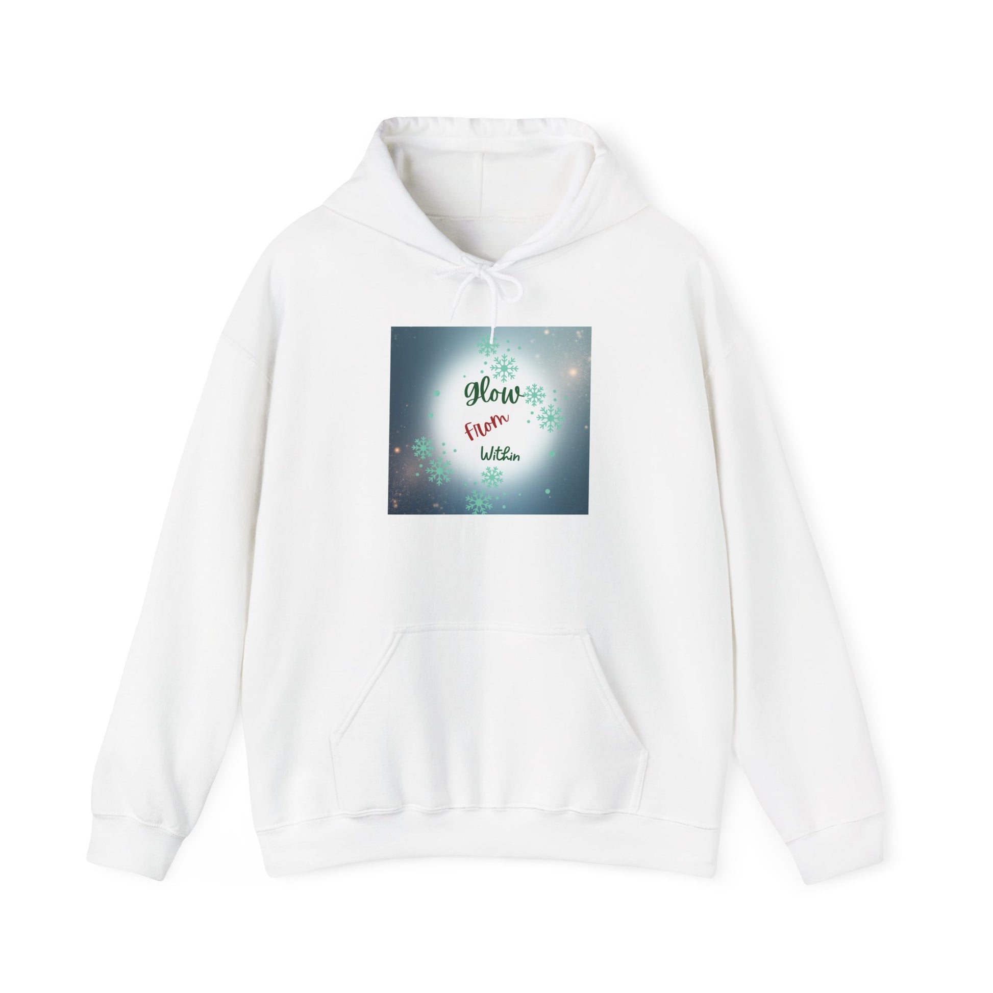 This cozy hooded sweatshirt wraps you in calm — a soft, medium-weight blend with a roomy kangaroo pocket and double-lined hood. The front carries a gentle, luminous square print that reads “Glow from Within,” set against a soft bokeh of lights and subtle floral accents. Wear it on slow mornings, after evening walks, or layered for quiet gatherings. The clean white canvas and respectful, uplifting message make this hoodie feel like a wearable pause: warm, simple, and quietly encouraging.