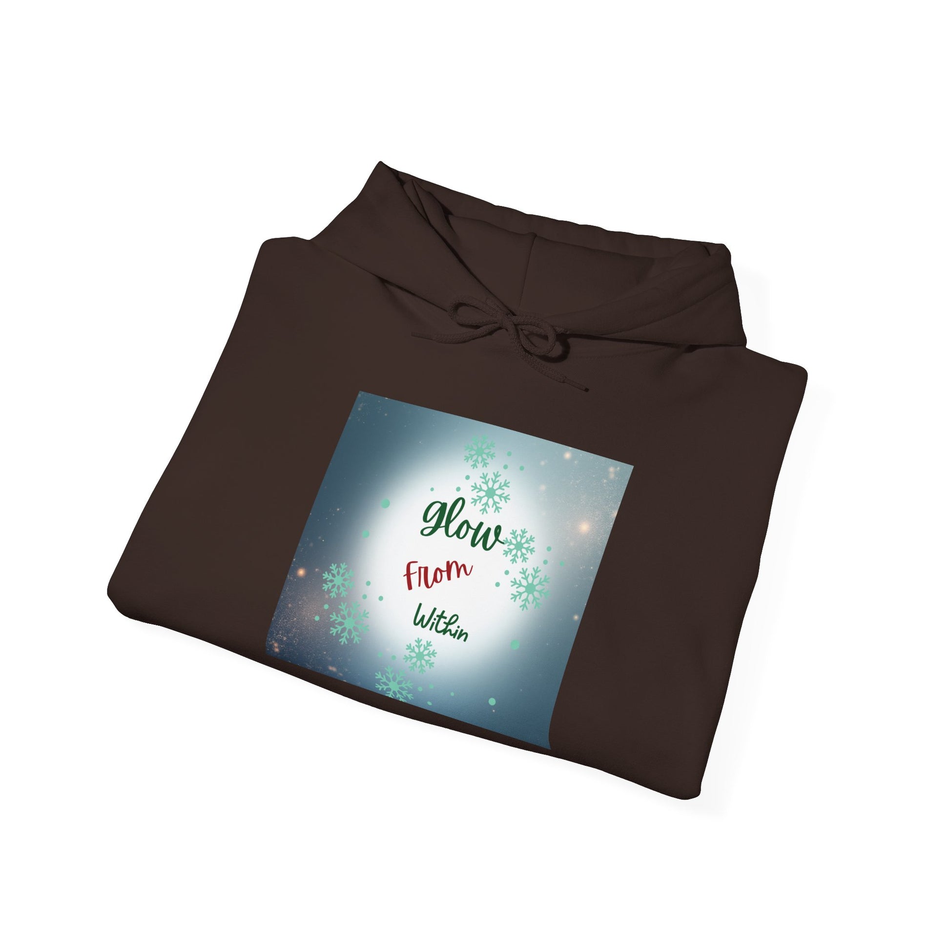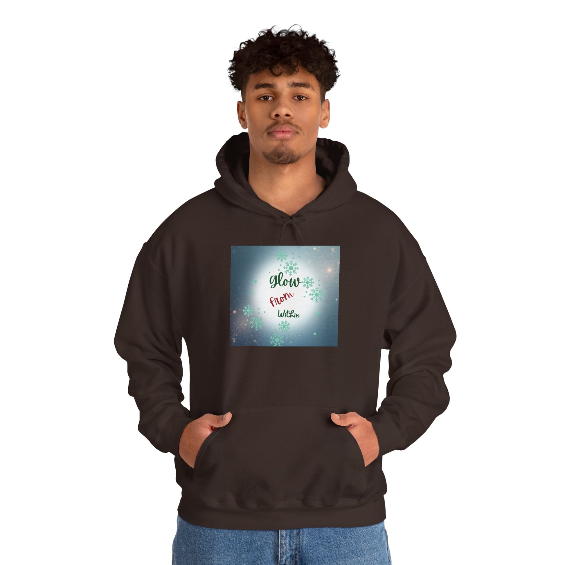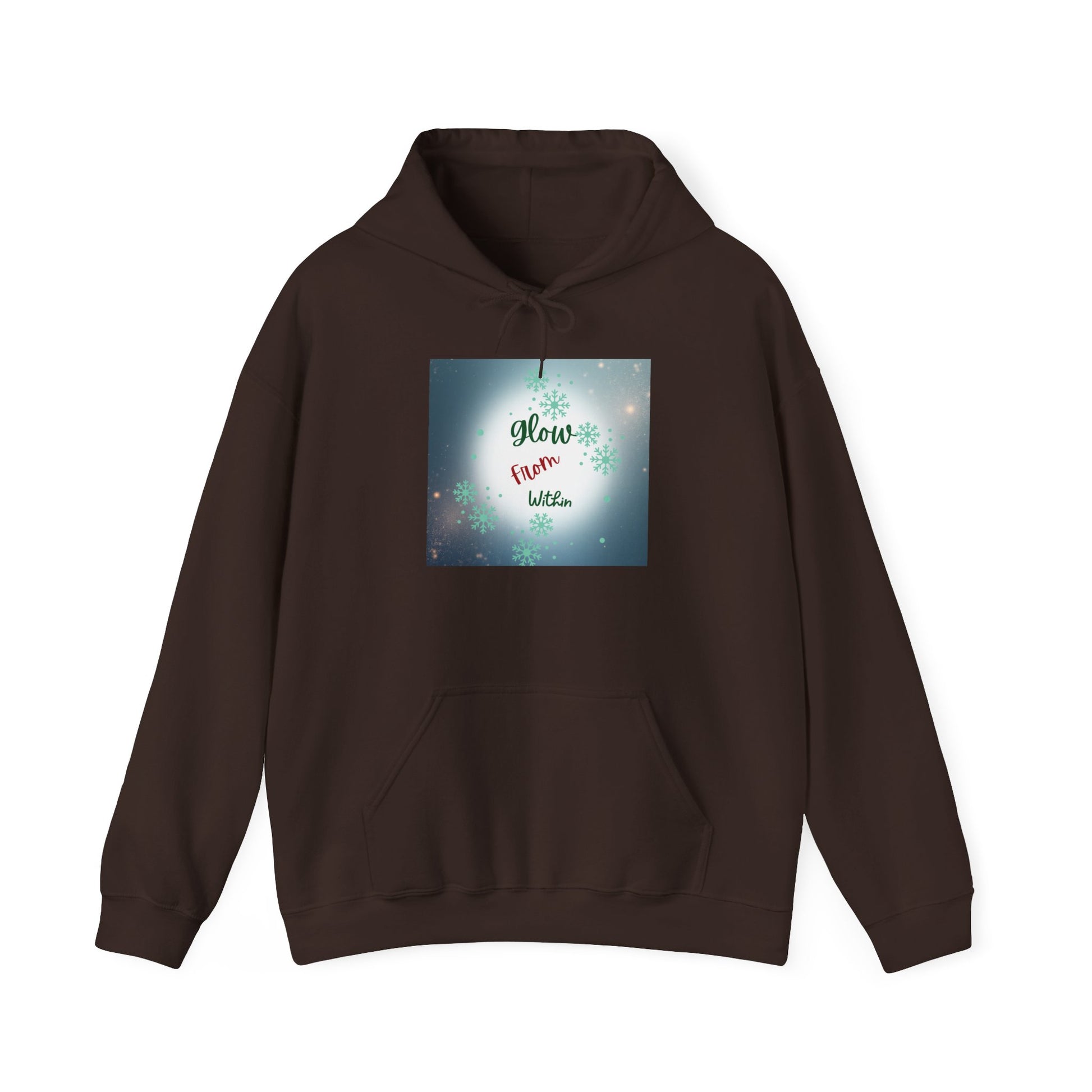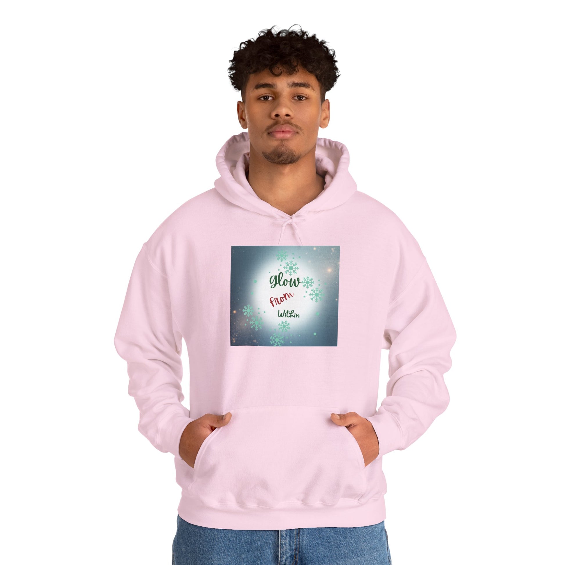 This cozy hooded sweatshirt wraps you in calm — a soft, medium-weight blend with a roomy kangaroo pocket and double-lined hood. The front carries a gentle, luminous square print that reads “Glow from Within,” set against a soft bokeh of lights and subtle floral accents. Wear it on slow mornings, after evening walks, or layered for quiet gatherings. The clean white canvas and respectful, uplifting message make this hoodie feel like a wearable pause: warm, simple, and quietly encouraging.