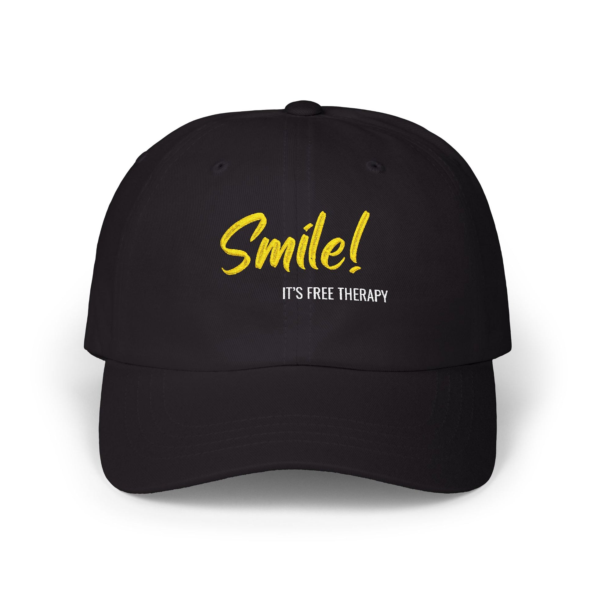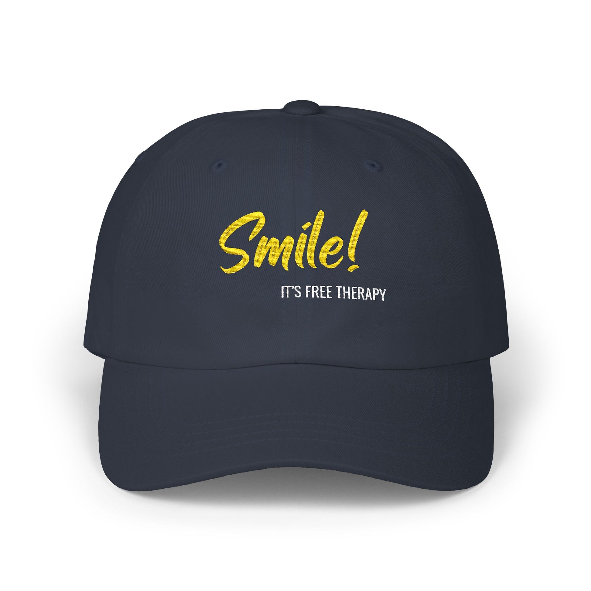A low-profile camo cap embroidered with a bright, hand-lettered message: “Smile! It’s free therapy.” Lightweight and unstructured, this cotton hat sits comfortably for all-day wear and folds easily into a bag. The pre-curved Permacurv® visor and color-matched underbill keep the look clean and casual, while the antique brass hideaway strap lets you fine-tune the fit. Worn on hikes, coffee runs, or around town, this cap brings a subtle, upbeat statement to rugged, everyday outfits and sparks small moments of connection where smiles matter most.